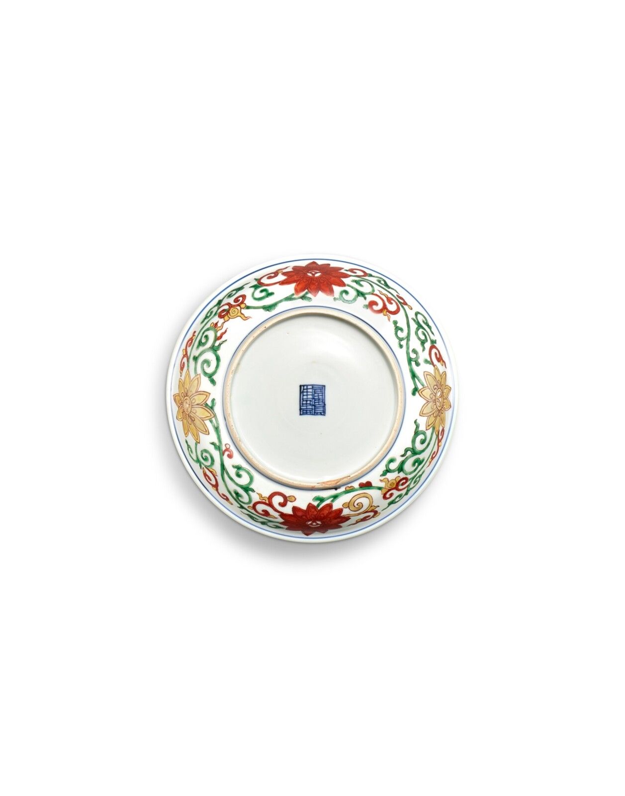 the interior with a large medallion enclosing a dragon and phoenix soaring around a 'flaming pearl' amidst floral sprays, the motif repeated around the cavetto, the underside with four large lotus blooms borne on leafy scrolls, the base with an underglaze-blue seal mark reading fugui jiaqi (fine vessel for the rich and honourable), Japanese wood box.
