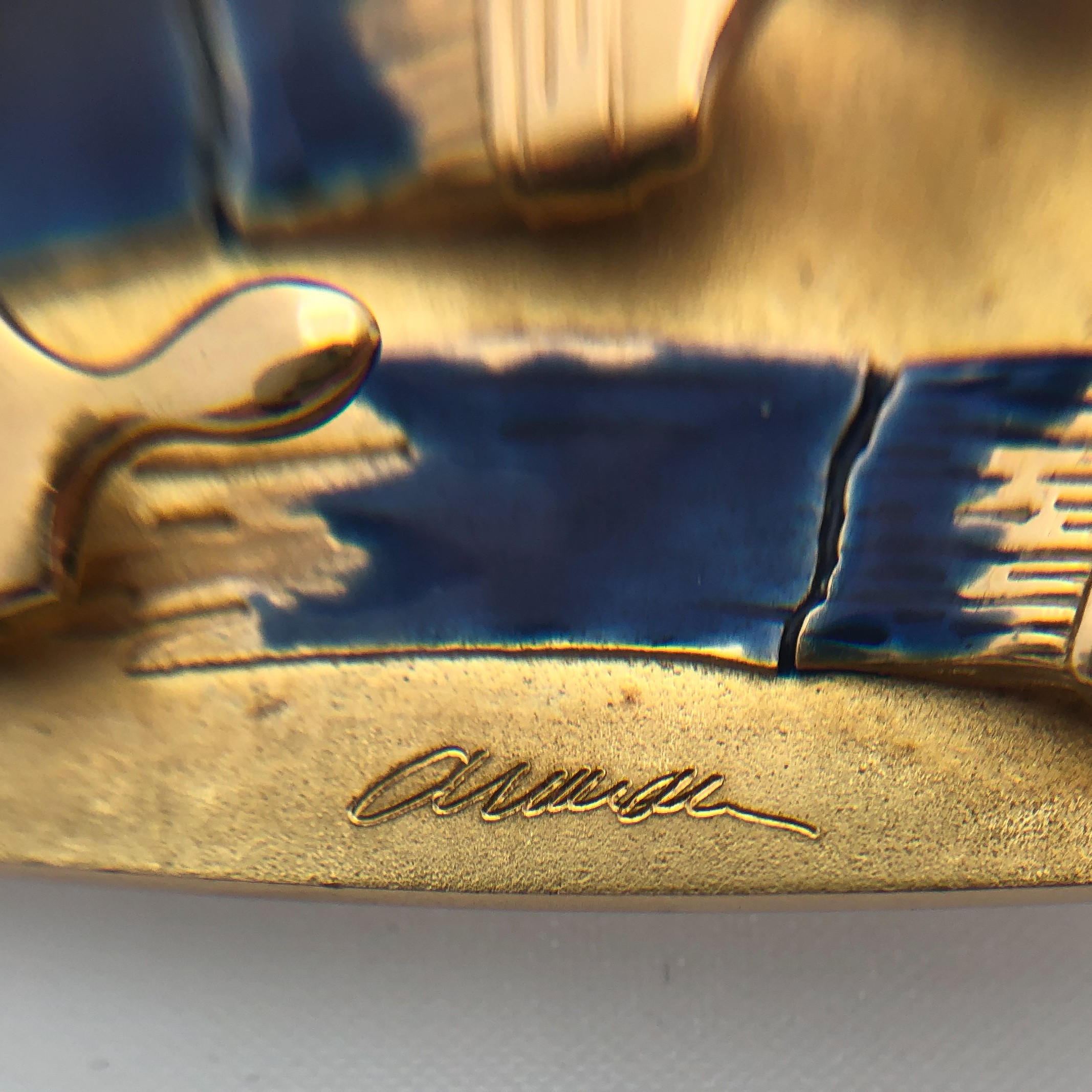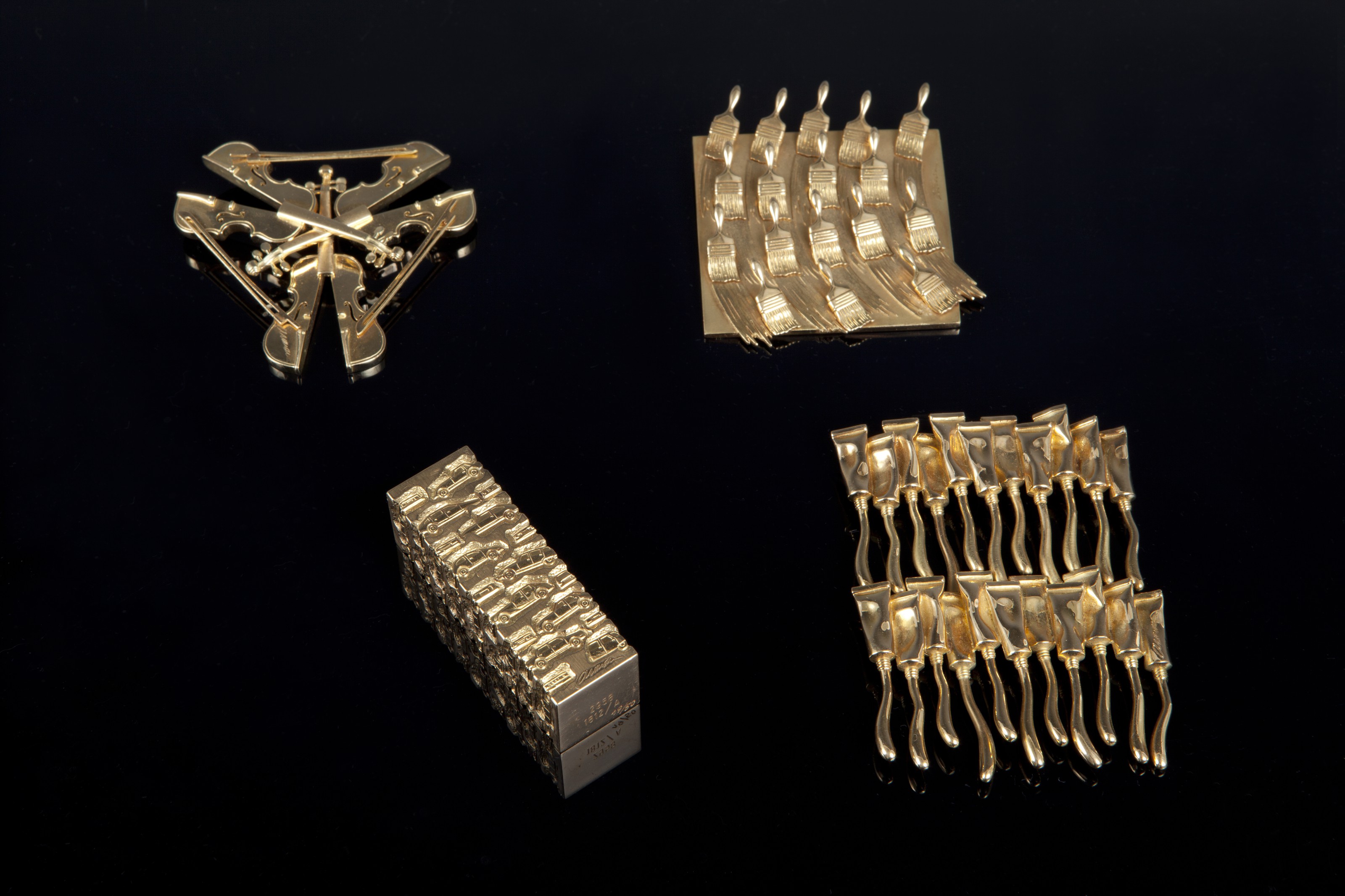 A ‘Pinceaux’ 18ct gold pendant with two suspension loops, decorated with 17 wet paint brushes and their brush strokes, number 19 from the edition of 25, inscribed 3012 1809/A, 19/25, signed Arman in the cast and stamped with Pierre Hugo's Société les Cyprès d'or and French eagle's head hallmarks, 6.1 high x 5.7 cm. wide (2 3/8 x 2 ¼ in.)