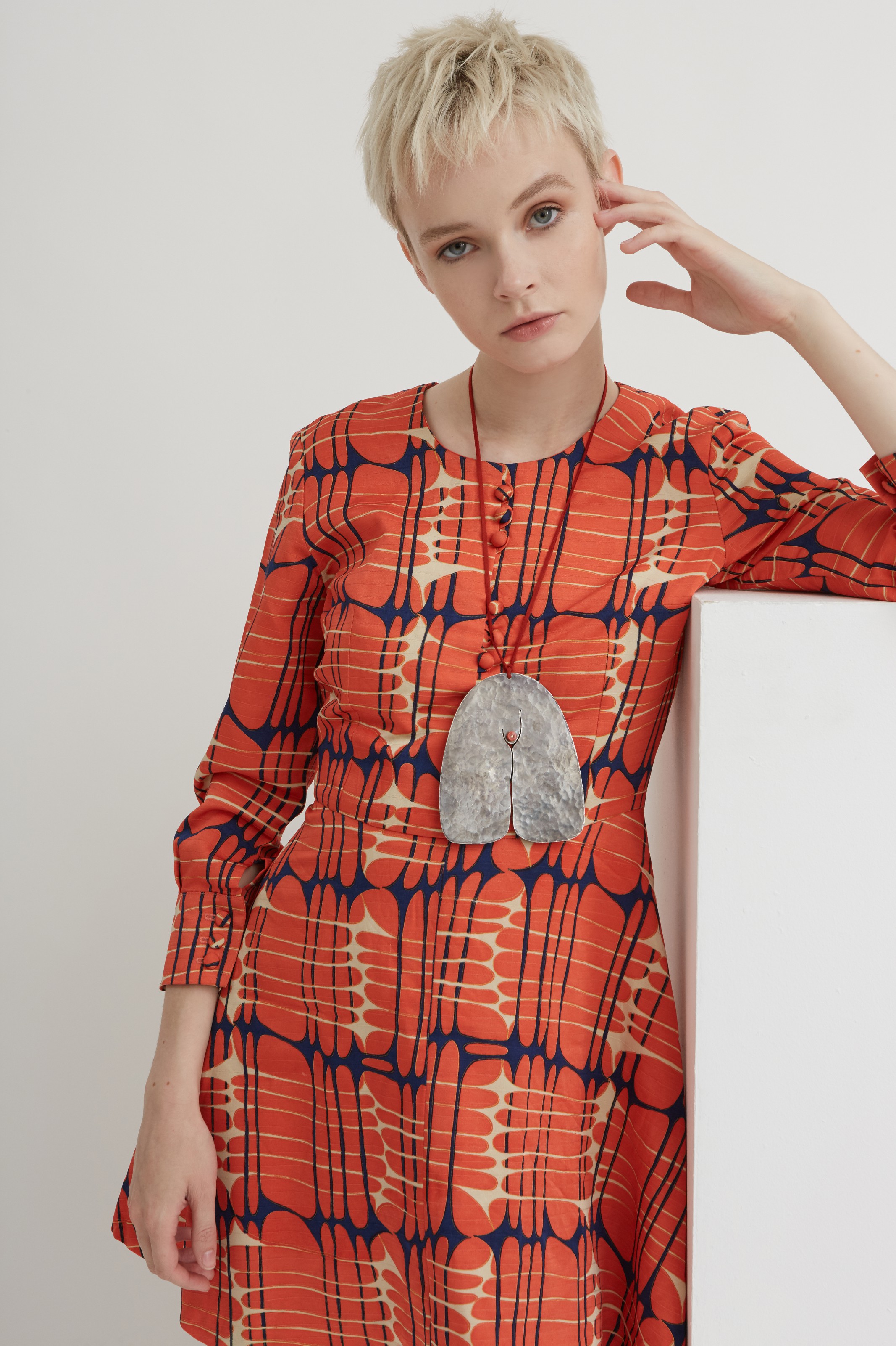 hand-hammered white metal, stylised lower female torso decorated with a cylindrical coral bead attached by a gold rivet, together with a certificate by Val Bertoia, dated 28 October, 2014, pendant 12 cm. square (4 ¾ in.)