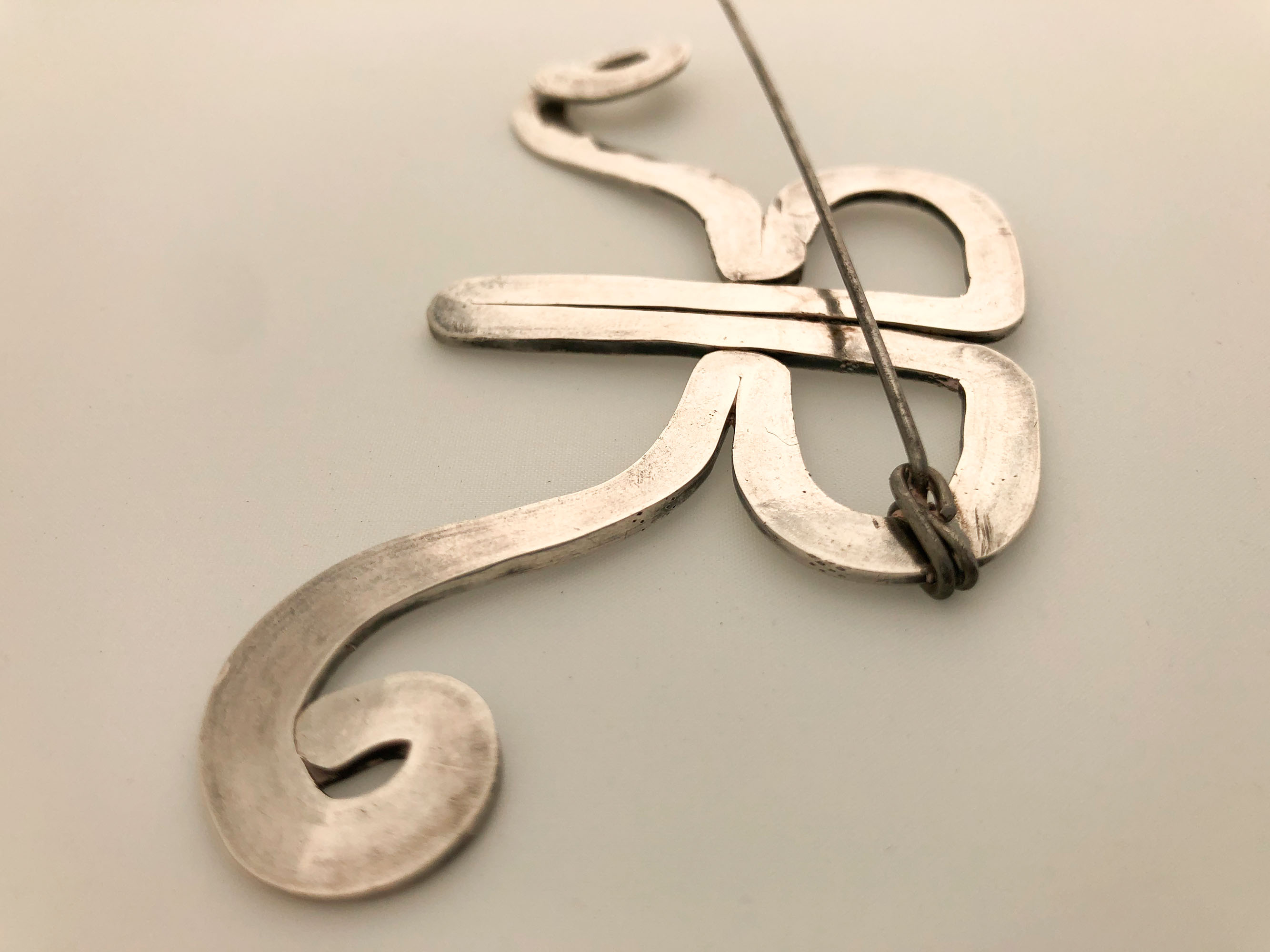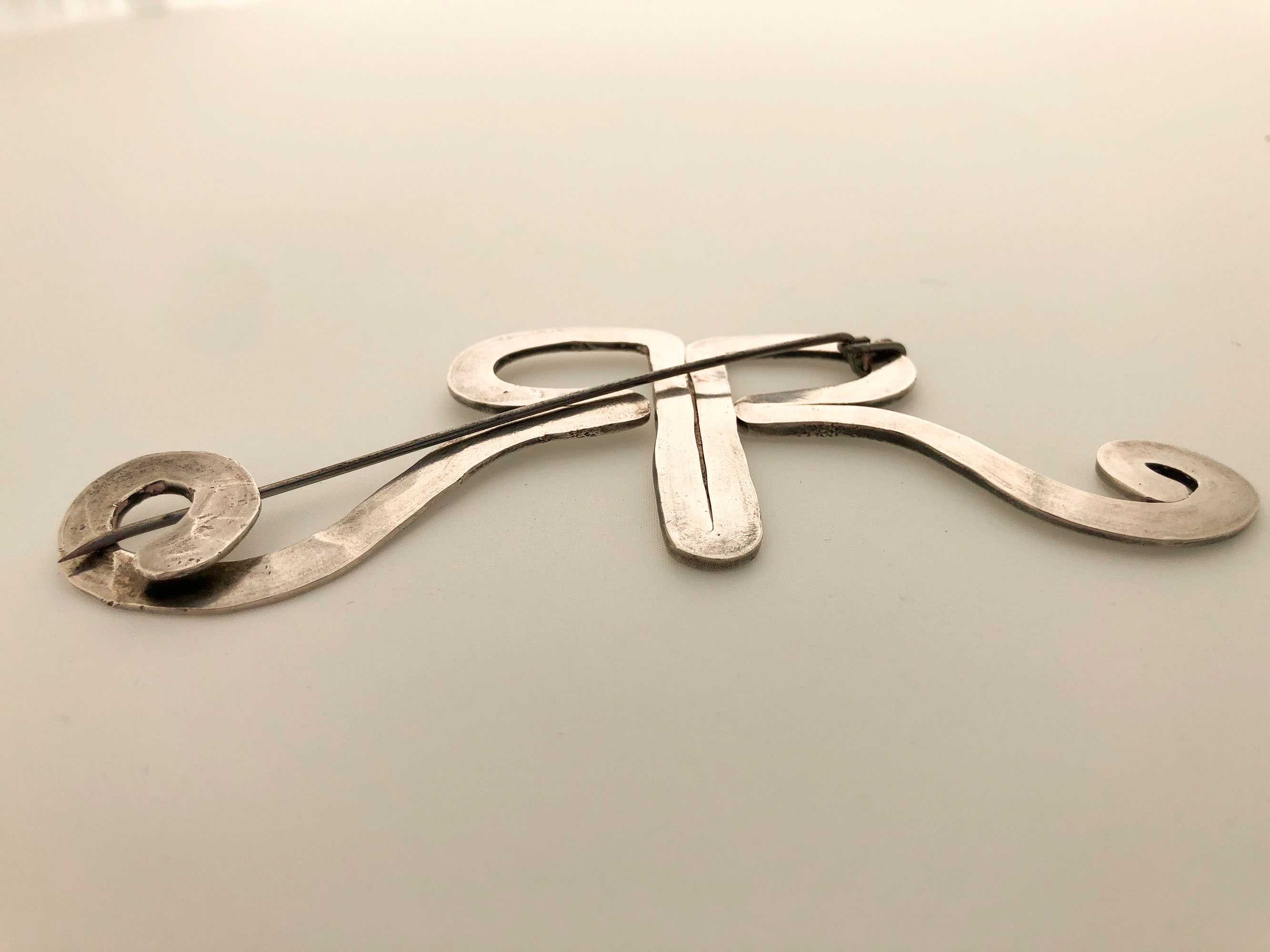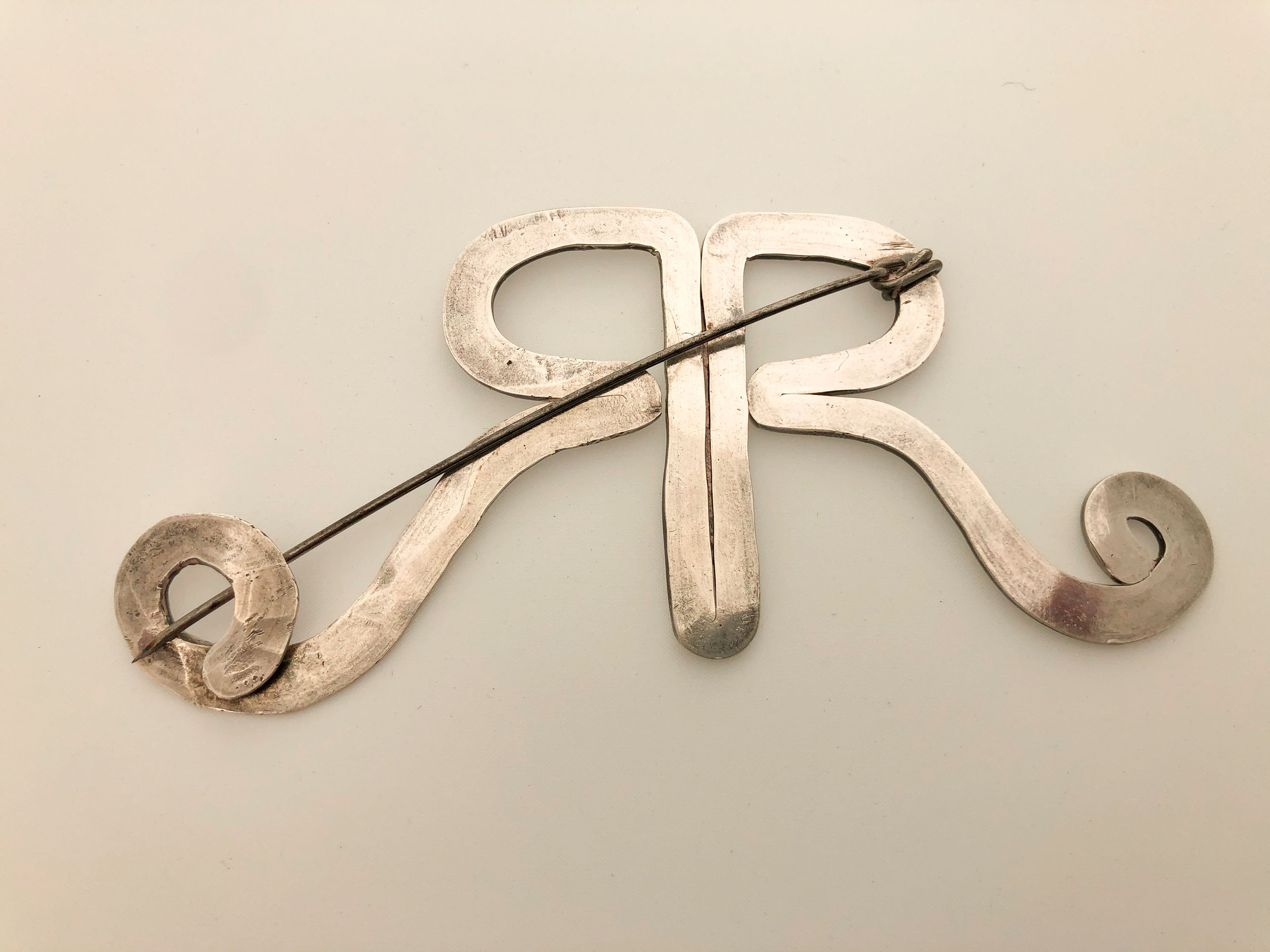 hand-hammered from a single piece of white metal wire and with a steel prong fastening, 5.2 high x 12 cm. wide (2 1/16 x 4 ¾ in.).