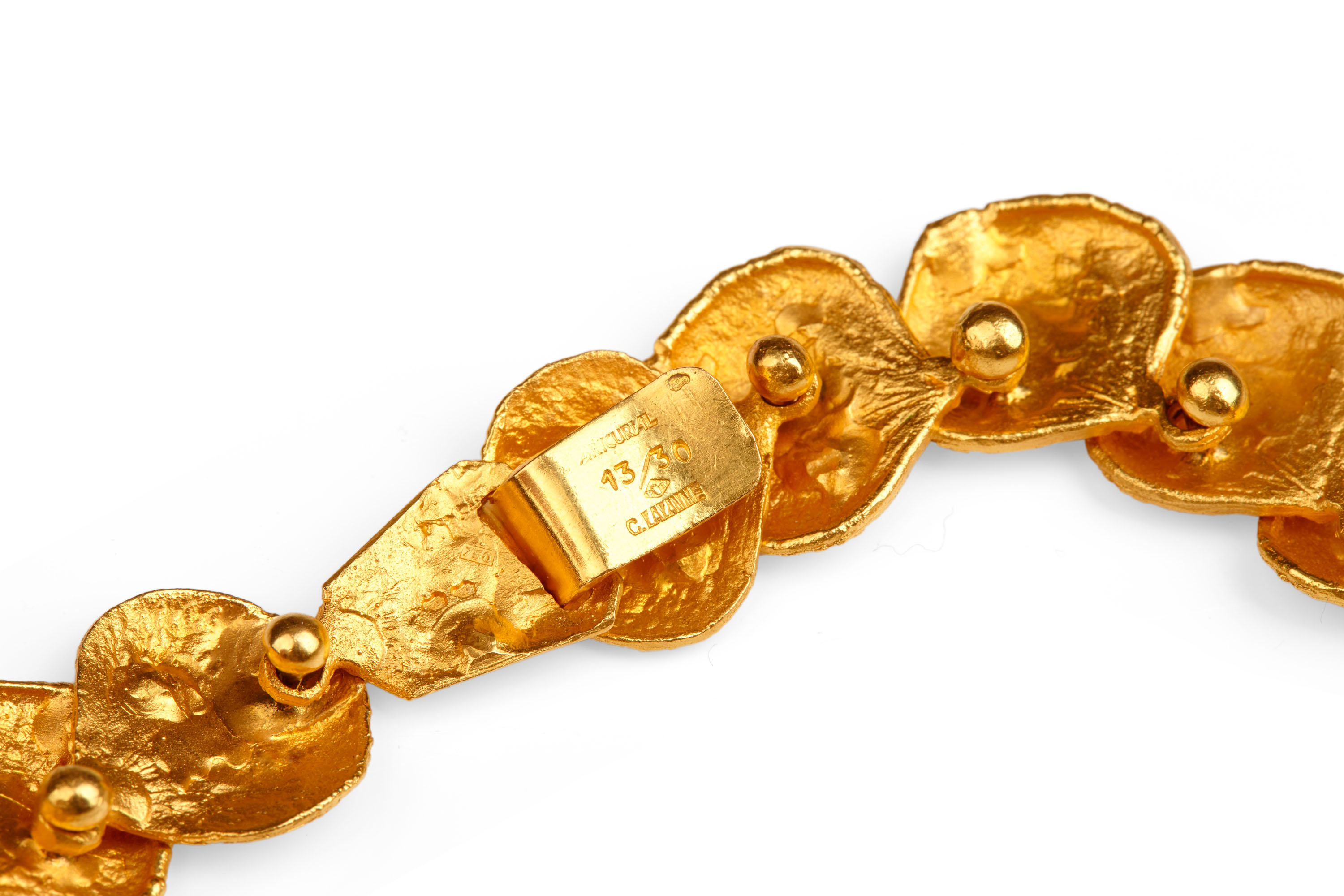 18ct gold, front fastening, formed from articulated hydrangea flower petals arranged in a graduated manner, together with original case marked Arcurial, edited by Artcurial, Paris, number 13 from the gold edition of 30, 38 cm. long (14.15/16 in.), stamped on back of clasp with two French eagle's head hallmarks, 750, and stamped on the hook ARTCURIAL, 13/30, PT maker's mark, C. LALANNE and with French eagle's head hallmark.