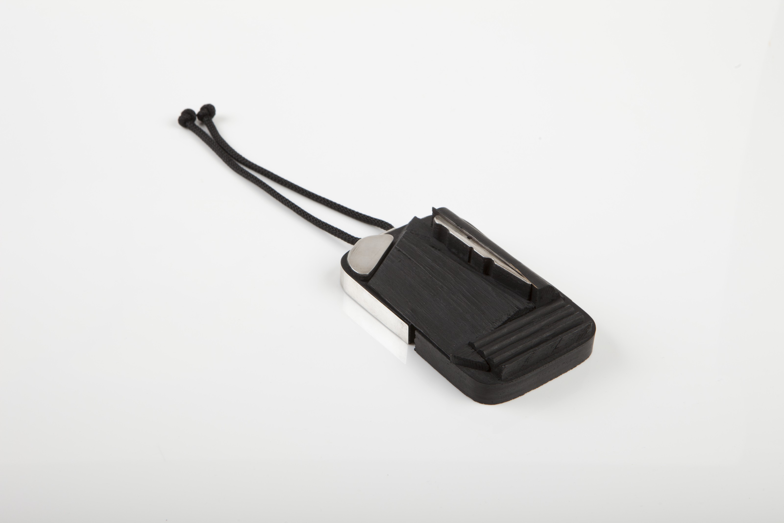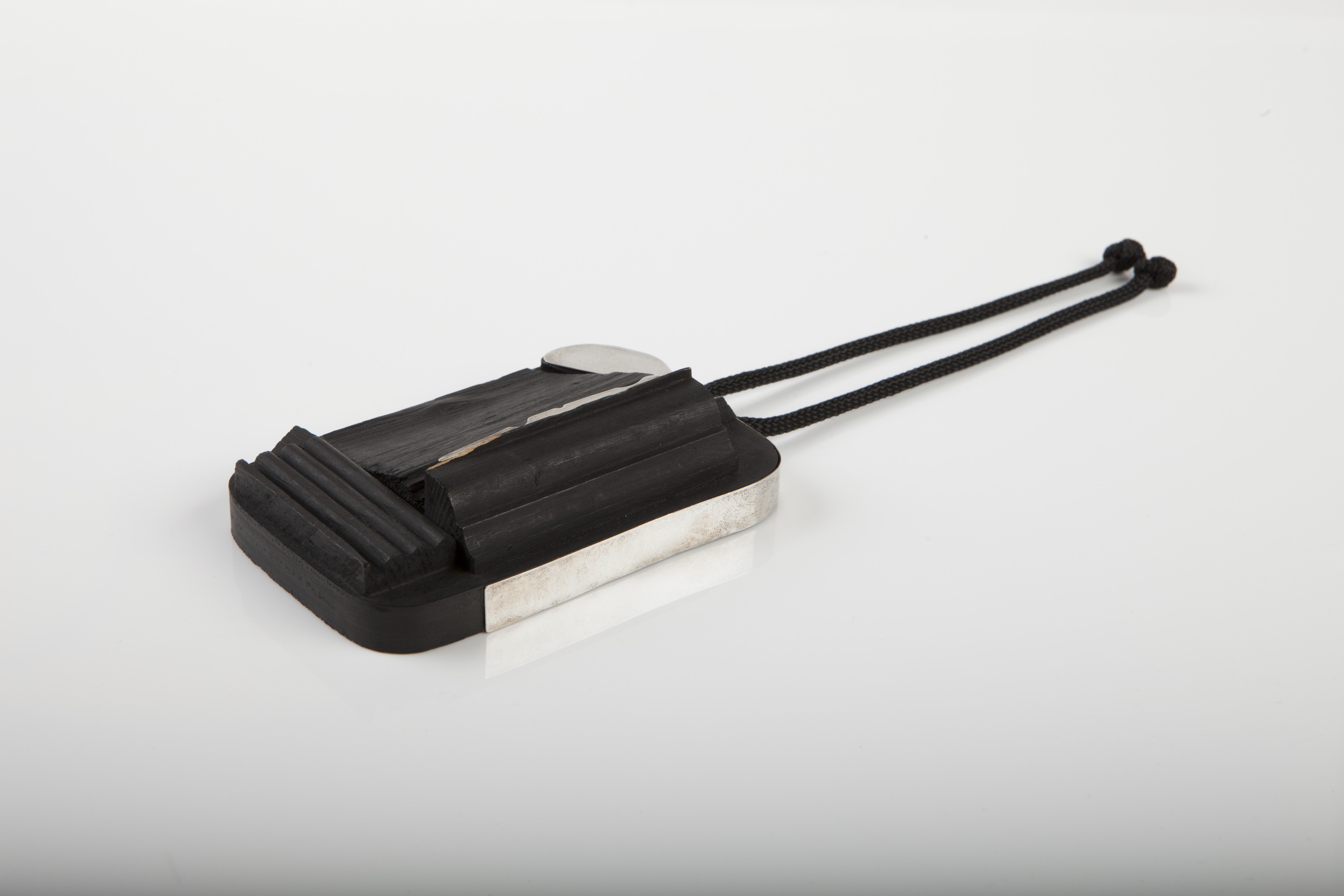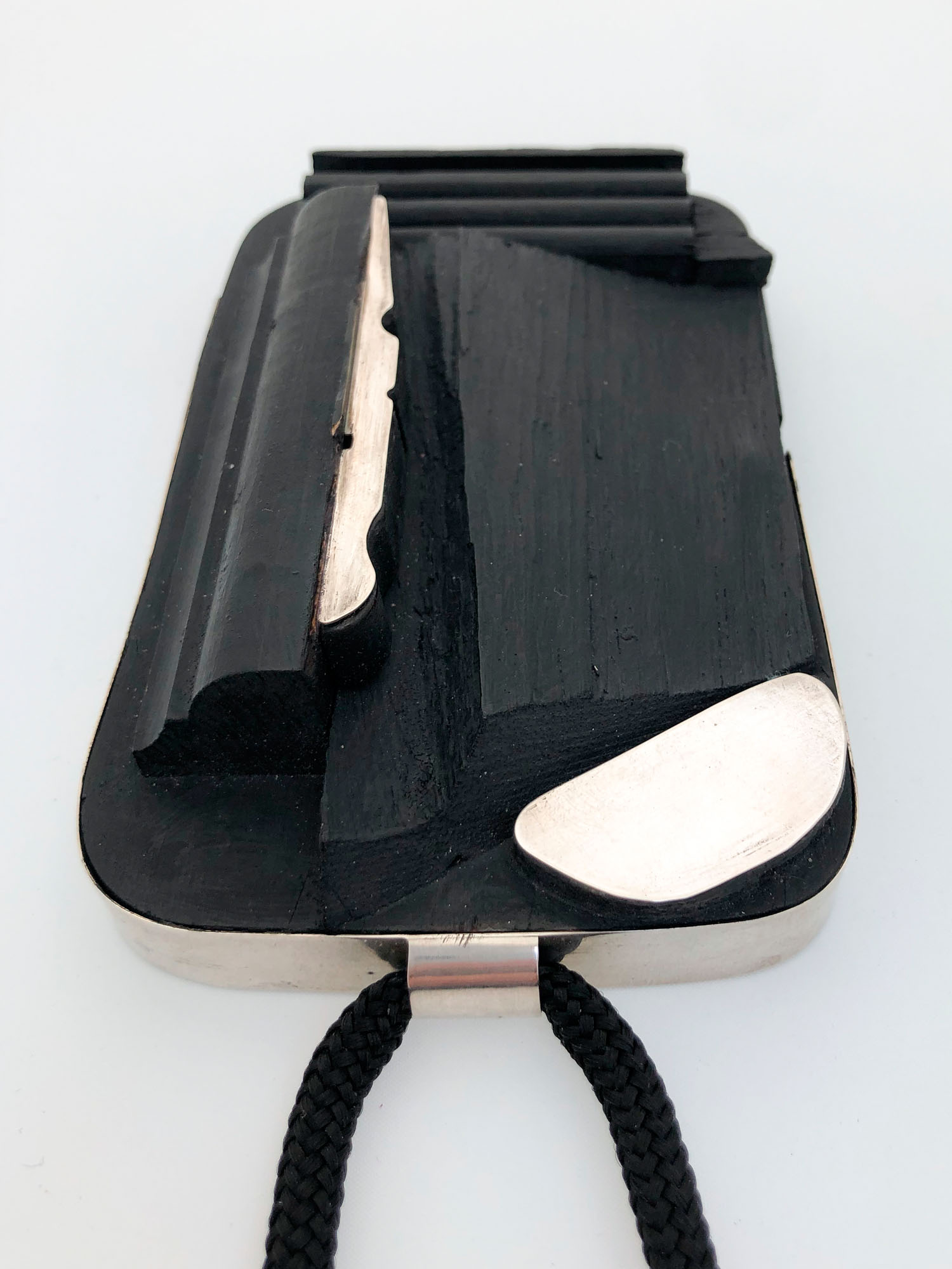 Note: Harry Bertoia first started making and indeed teaching jewellery while he was head of the metalwork department at the Cranbrook Academy of Art during the Second World War. As metal supplies dwindled during the war, Bertoia started to work out his ideas on a smaller scale, his jewels becoming maquettes with which to organise and develop his ideas. Like Calder, he set himself severe working limitations by only using cold connections, which meant he refused to use solder, preferring instead to use rivets, like the gold rod that holds the coral bead in place on this pendant. Of large and impressive scale, the pendant features a gently hammered surface, with finer hammering towards the edges, that appears inspired by prehistoric flint tools and arrowheads. To achieve this personality the silver was repeatedly hand-beaten heavily, reheated, and hand-beaten again to compress the crystalline structure and make for a very hard metal that vibrates and resonates when tapped. This process takes great skill and assuredness — too much beating and the silver becomes brittle. Reheat it too much it can melt or the surface become crizzled. Afterwards, this piece was given a deliberate dark patination through a process of chemical oxidisation. The pendant therefore incorporates sonic as well as sculptural properties, confirming the importance of Bertoia’s handcrafted jewellery alongside the vast portfolio of metal sculptures executed during his lifetime, from ‘Sonambient’ to ‘Bush’ forms, all meticulously executed to perfection.