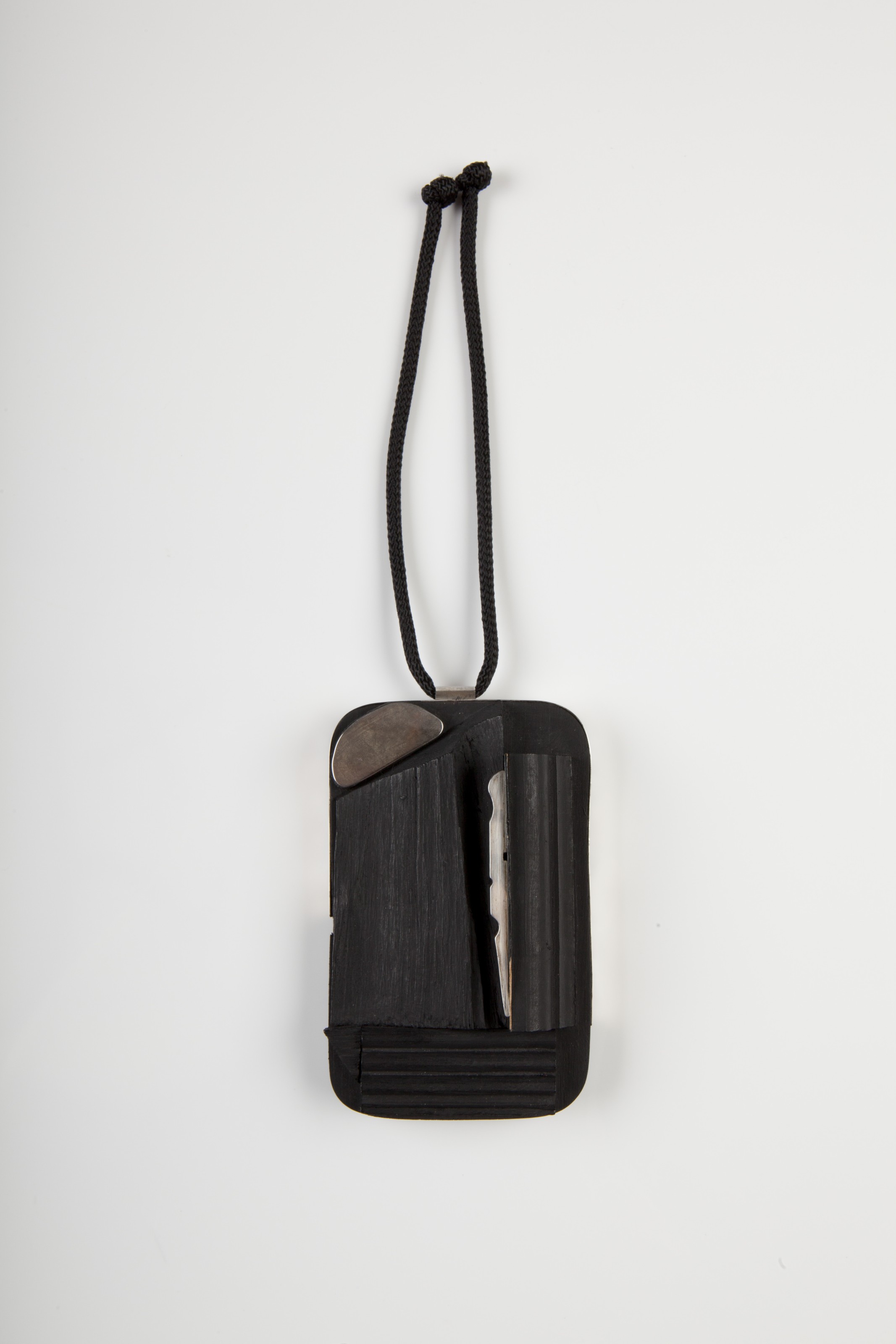 painted wood, of rectangular shape with rounded corners, the top set with a selection of wood off-cuts and mouldings and even half a clothes peg, all painted in the artist's typical matt black and highlighted with white metal and with suspension loop, 12 high x 7.9 wide x 3.2 cm. deep (4 ¾ x 3 1/8 x 1 ¼ in.), reverse with applied strip of white tape numbered with Pace Wildenstein’s, New York, inventory number 28406 in black ink.