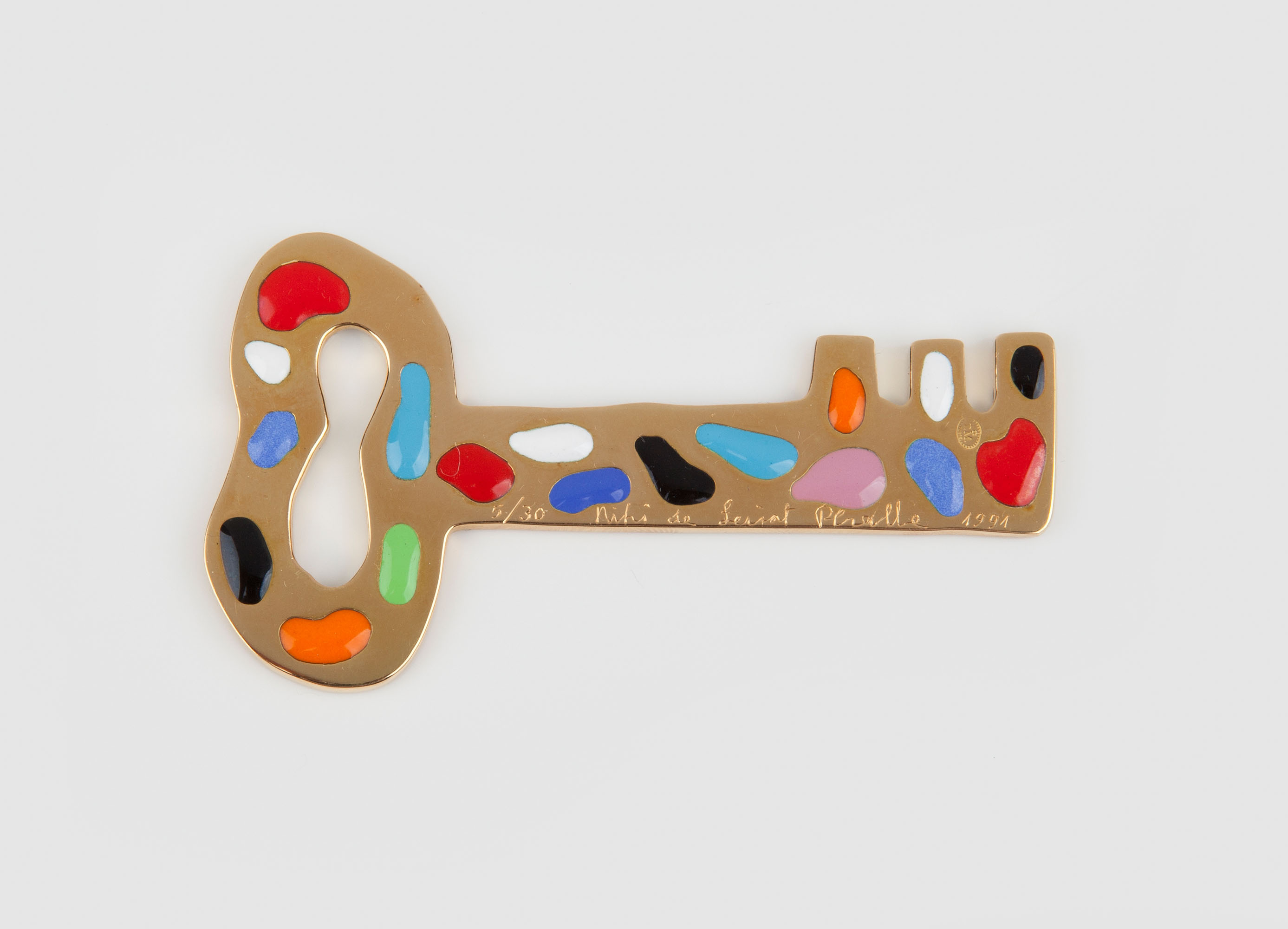 Note: De Saint Phalle designed her first jewellery in 1971 in collaboration with GianCarlo Montebello in Milan, and again in the late 1980s with Diana Küppers in Mülheim. This gold and enamel key dates to this latter period, and is a perfect example of her characteristic, colourful Pop style. Conceived to be casually, informally worn around the neck suspended from a thong, with this design De Saint Phalle inverts to playful effect the youthful tradition of wearing one’s own housekey around one’s neck.