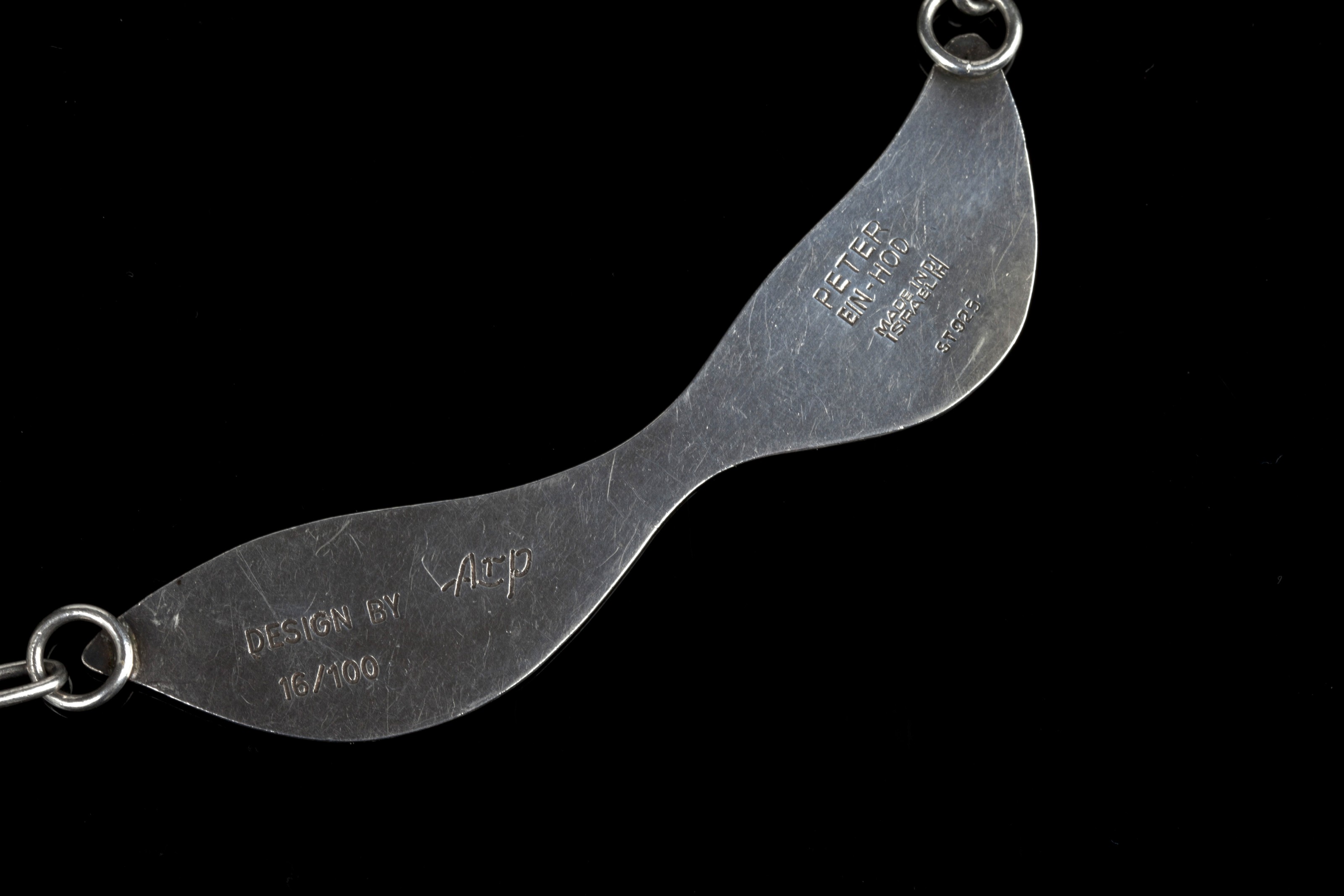 925 sterling with broken bottle head pendant set with polished cabochon carnelian and chrysoprase eyes, and with a flat moustache-shaped link to either side, joined by long rounded oval links with hook fastening, produced by Johanaan Peter Ein Hod, Israel, number 16 from the edition of 100, pendant 7.8 high x 5.5 cm. diameter (3 1/16 x 2 1/8 in.), overall 48.5 cm. long (19 in.), stamped on reverse DESIGN BY Arp, 16/100, PETER EIN-HOD, MADE IN ISRAEL, ST 925.