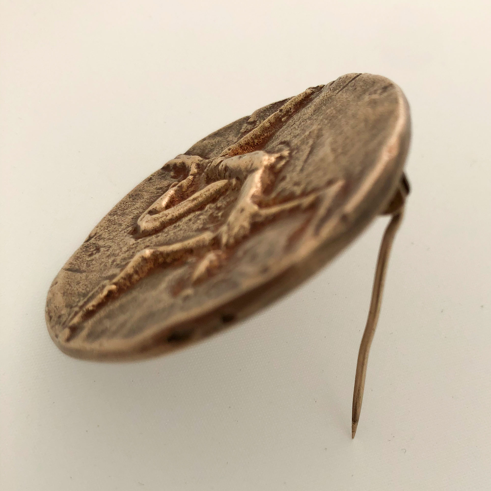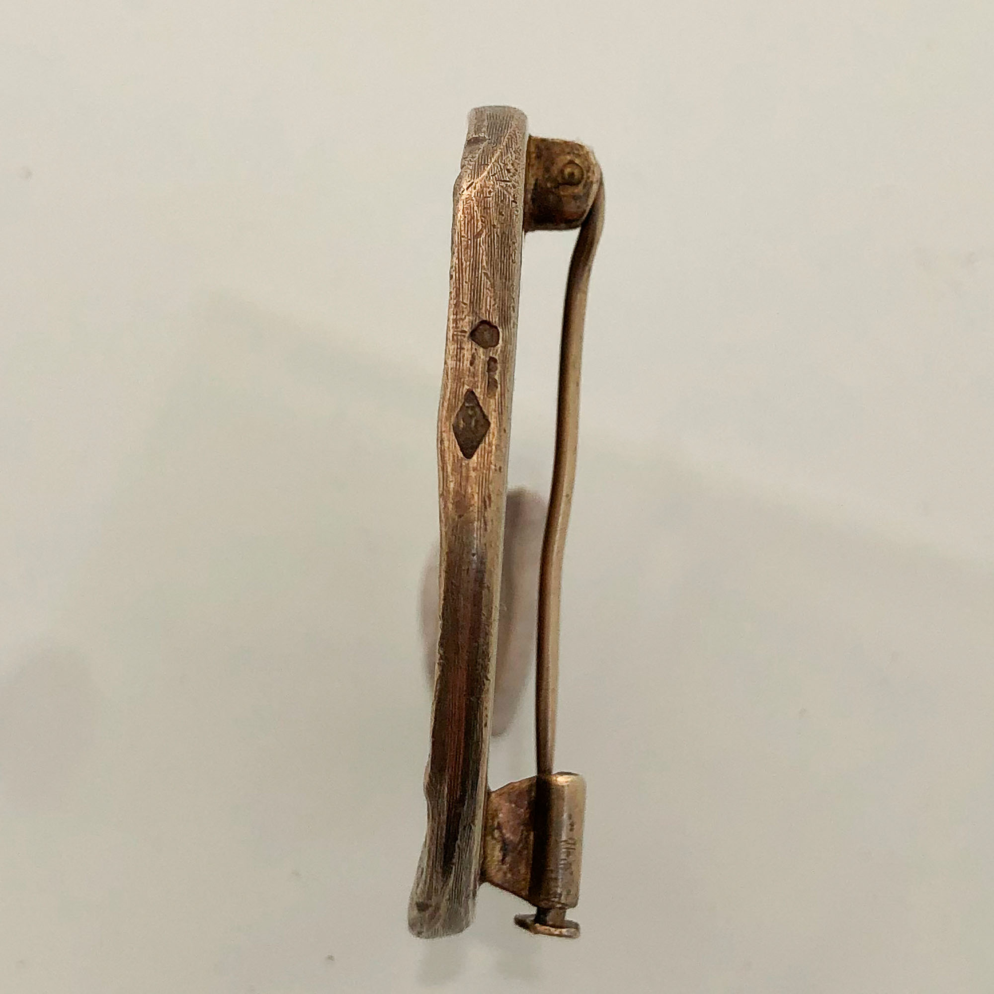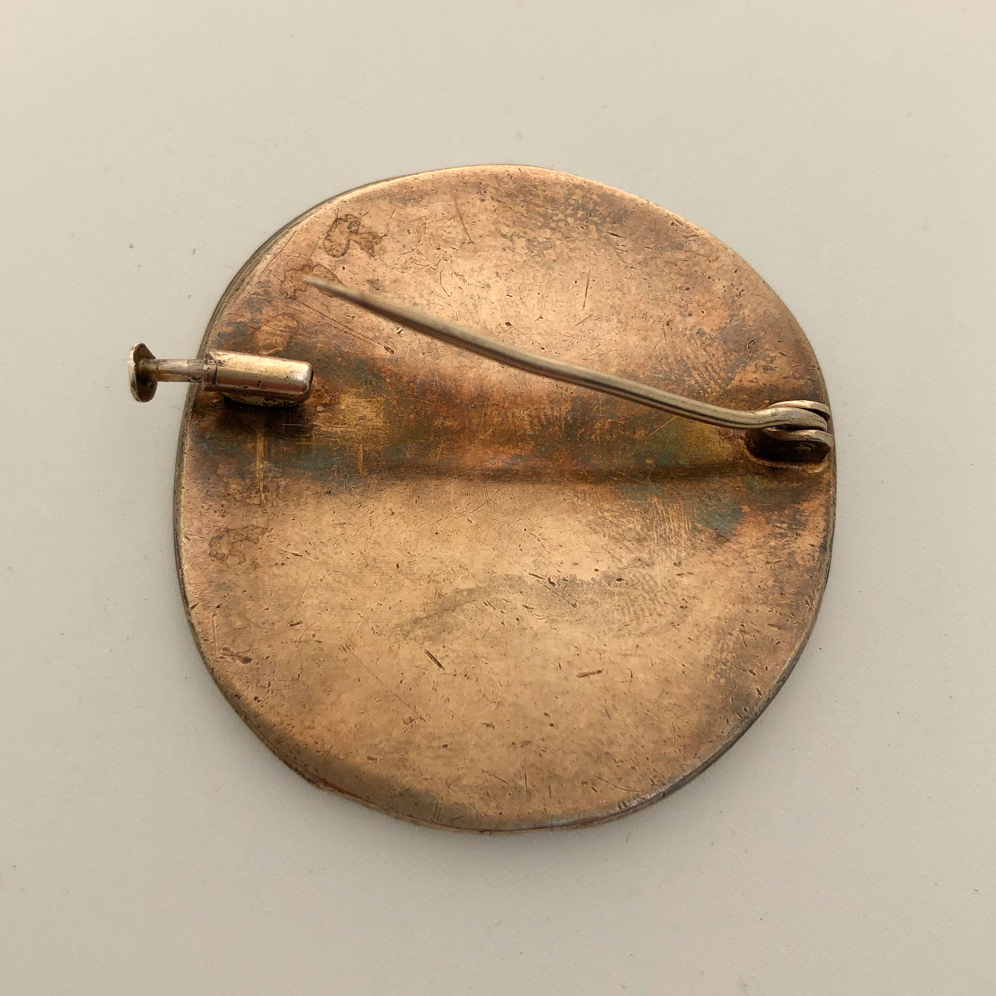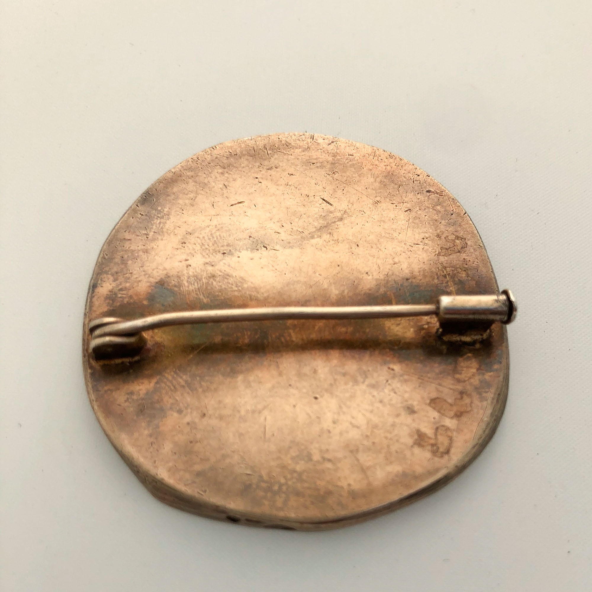 silver-gilt brooch cast with the figure of a man with typical elongated limbs in sunken relief, cast by Pierre Monsel, 4 cm. diameter (1 9/16 in.), stamped on the edge with French boar's head hallmark and Pierre Monsel maker's mark PM either side of a chalice.